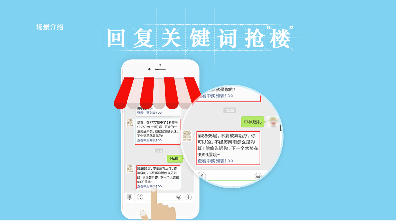 聚力商城发布为双十一预热的抢楼活动,活动持续4天,时间为每天12:00——14:00。商家提前在指定楼层设置好奖品,粉丝在公众平台直接回复关键词“抢楼”参与活动,每次回复算抢到一个楼层,抢到有奖励的楼层即可获得奖品。在活动开始10分钟,楼层达到3.2万层,活动总楼层为30万层。